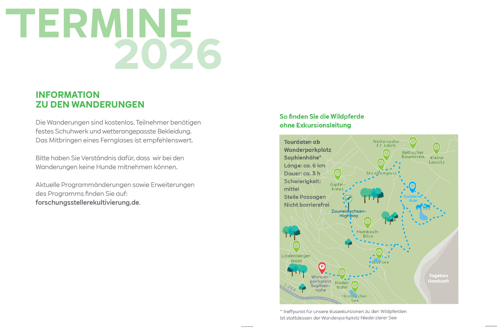 Der beste Weg die Rekultivierung kennenzulernen ist natürlich direkt vor Ort. Aus diesem Grund bieten Mitarbeitende der Forschungsstelle sowie extern beauftragte Natur- und Landschaftsführer:innen regelmäßig naturkundliche Exkursionen und Veranstaltungen in den Rekultivierungsgebieten an.