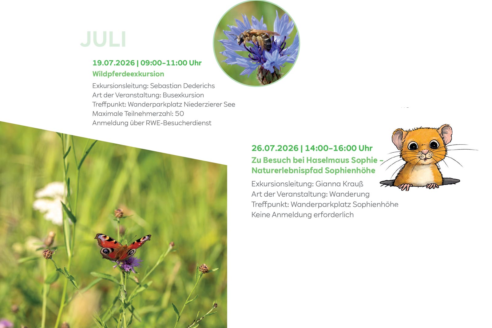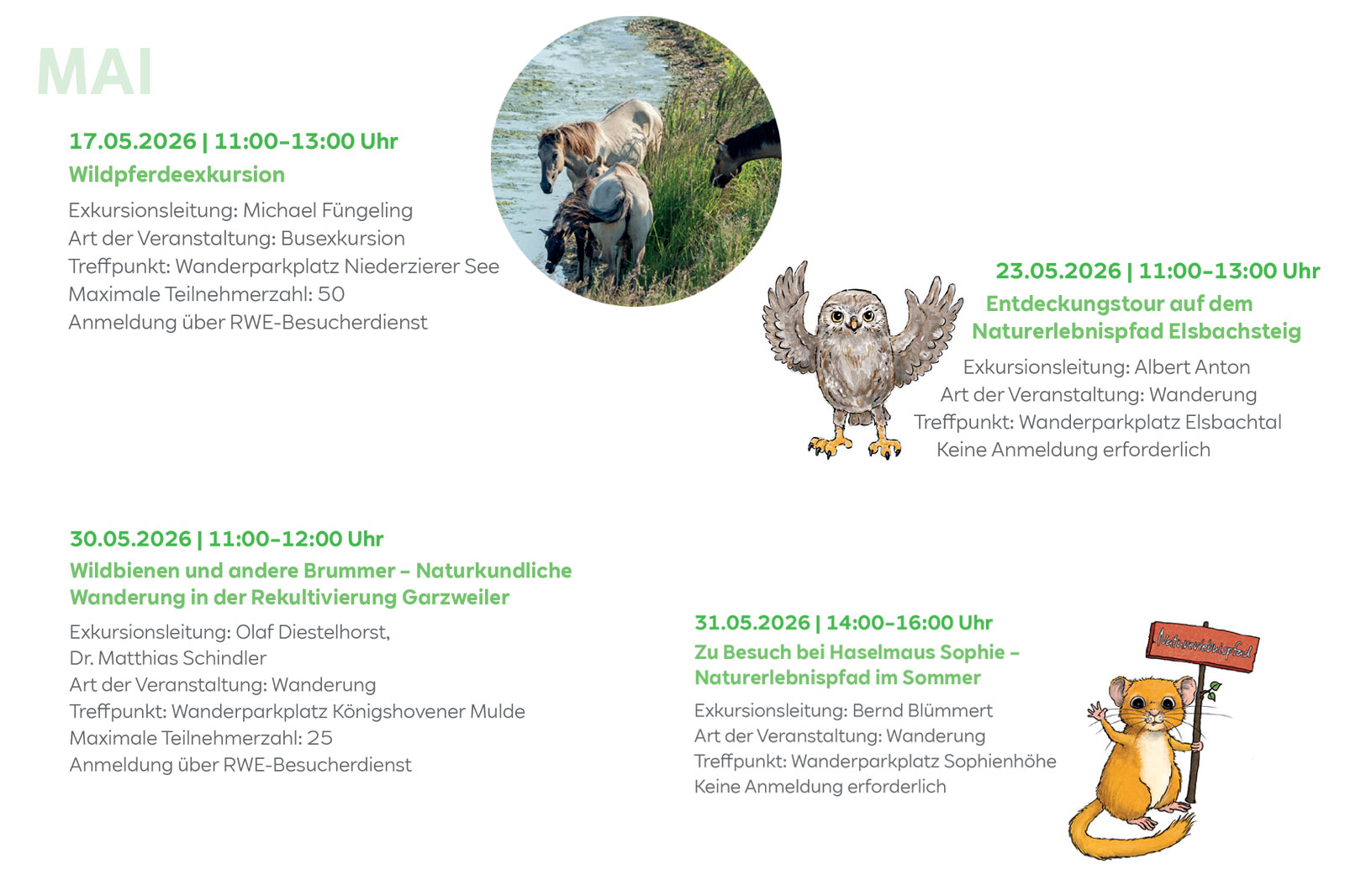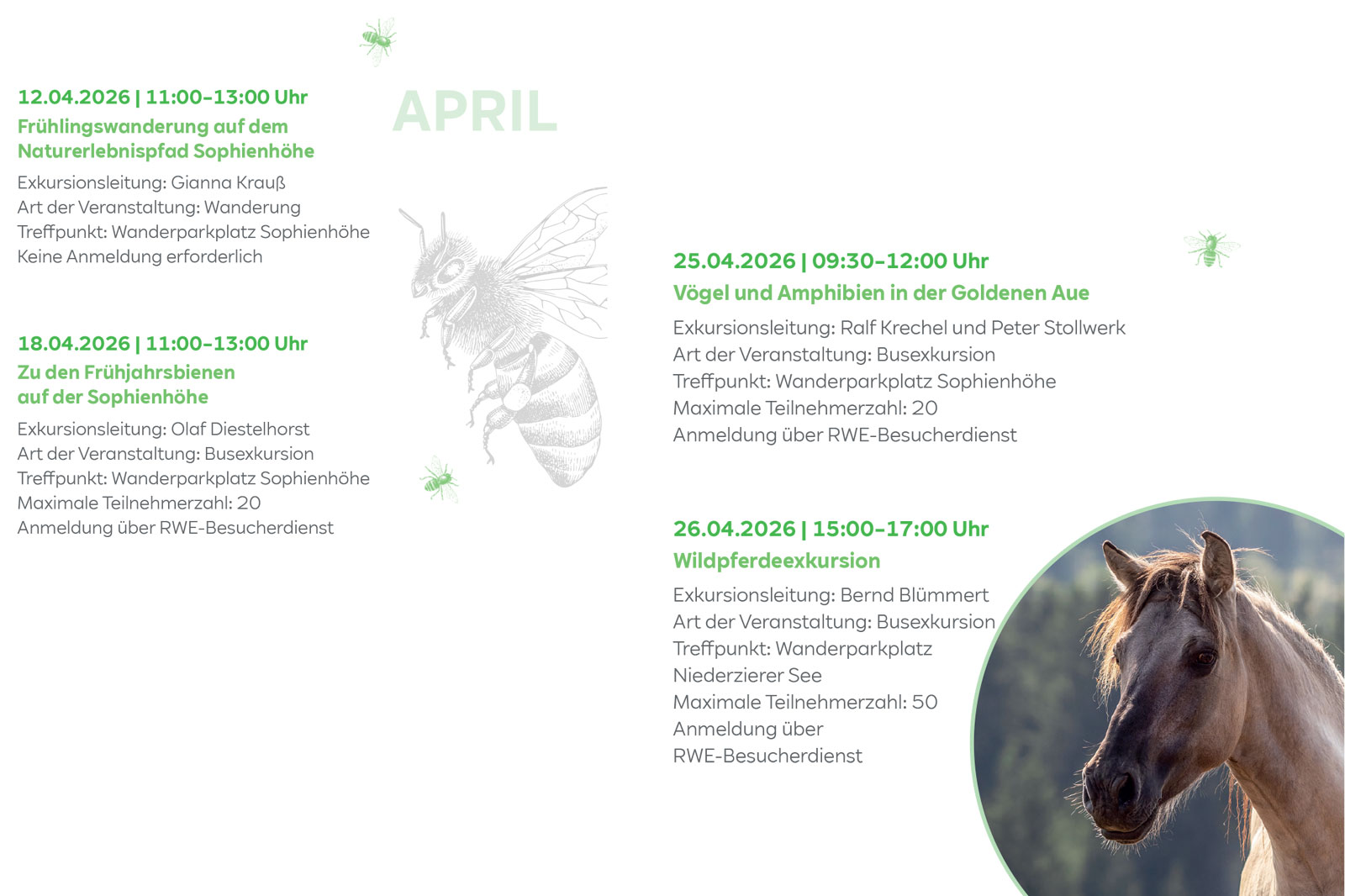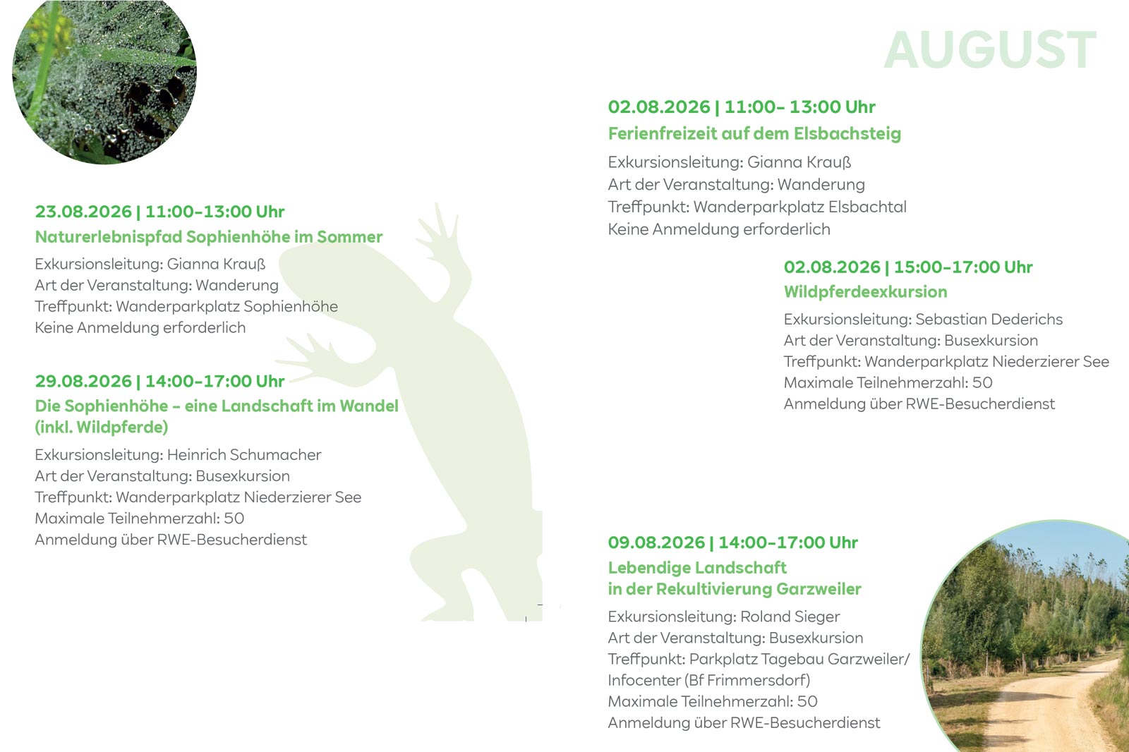 Dabei werden die Kontaktdaten abgefragt und der Treffpunkt für die Exkursion mitgeteilt. Sie benötigen festes Schuhwerk und wetterangepasste Bekleidung. Das Mitbringen eines Fernglases ist empfehlenswert. Bitte haben Sie Verständnis dafür, dass wir keine Hunde bei den Wanderungen mitnehmen können.