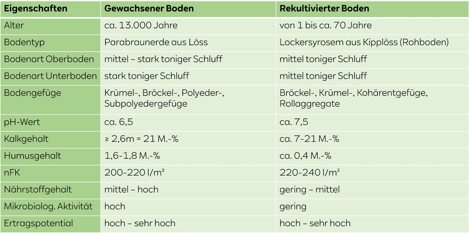 Bei optimaler Rekultivierung liegen die Gesamtporenvolumina rekultivierter Lössböden bei über 40 Vol. % und die Trockenrohdichten bei bis zu 1,6 g/cm³ Boden. So liegen diese oftmals unter den Werten vergleichbarer Altlandböden. Die nutzbaren Feldkapazitäten sind dann hoch bis sehr hoch mit Werten zwischen 20 – 25 – (28) Vol. %. Entsprechend sind diese Böden in ihrem Ertragspotenzial mit den Altlandböden der Region vergleichbar.