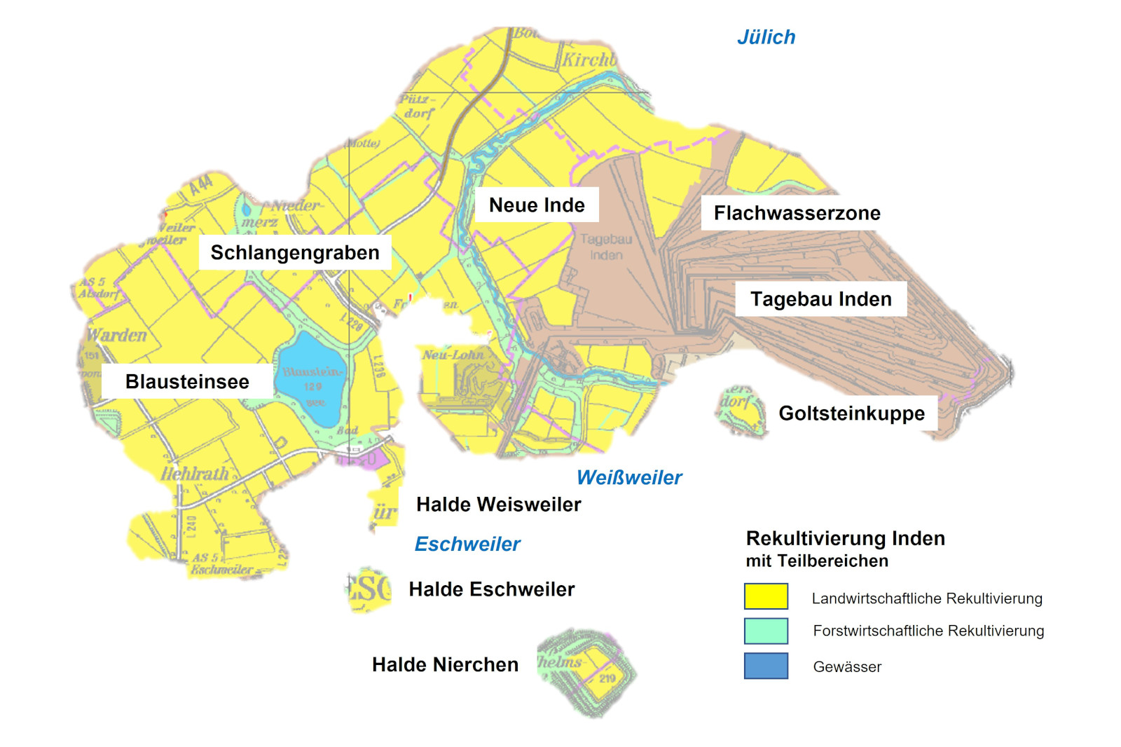 Der Tagebau Inden wird noch bis 2029 betrieben. Ein Großteil des Tagebaus wird anschließend als Tagebausee mit einer Fläche von 11 km² und einer Tiefe von 180 Meter bestehen bleiben. Die Befüllung des Sees wird 30 bis 35 Jahre dauern und über eine Leitung aus der Ruhr, natürlich immer unter Berücksichtigung des aktuellen Pegelstands, erfolgen. Das südliche Ufer wird der Freizeitnutzung vorbehalten sein, während das Nordufer des Sees Naturschutzzwecken dienen soll. Hier sollen vor allem Flachwasserbereiche, nach Vorbild der bereits existierenden Flachwasserzone, entstehen.