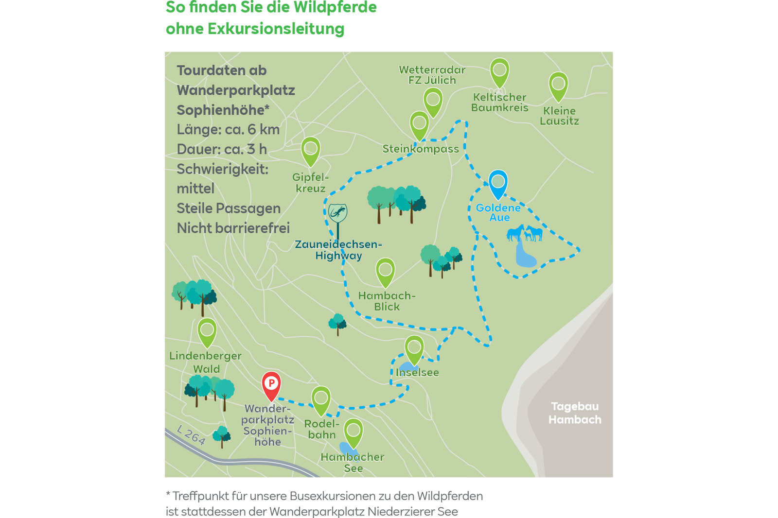 Die ganze Sophienhöhe ist durch Wander- und Radwege für Besucher zugänglich. Neben den Wildpferden gibt es einen Naturerlebnispfad und weitere interessante Stationen, die besucht werden können. Die Wildpferde befinden sich in der Goldenen Aue auf einer Anhöhe der Sophienhöhe. Das Gebiet ist nur zu Fuß oder per Fahrrad zu erreichen. Der Rundweg vom Wanderparkplatz Sophienhöhe ist 6 km lang und enthält einige steile Passagen. Bringen Sie ausreichend Zeit und passendes Schuhwerk mit! Wir bieten auch regelmäßig geführte Exkursionen per Bus oder zu Fuß auf die Sophienhöhe an. Eine Wanderkarte finden Sie hier.