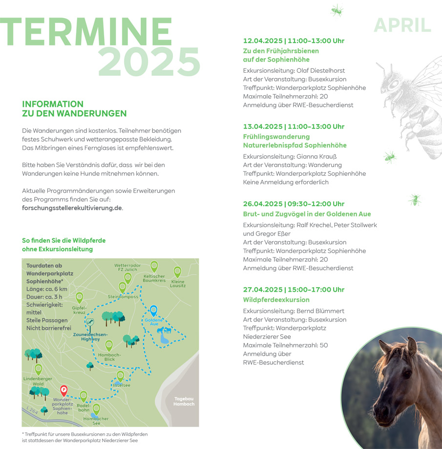Der beste Weg die Rekultivierung kennenzulernen ist natürlich direkt vor Ort. Aus diesem Grund bieten Mitarbeitende der Forschungsstelle sowie extern beauftragte Natur- und Landschaftsführer:innen regelmäßig naturkundliche Exkursionen und Veranstaltungen in den Rekultivierungsgebieten an.